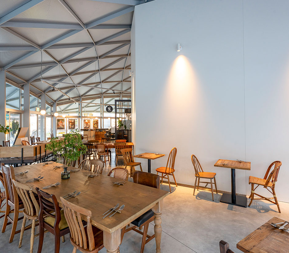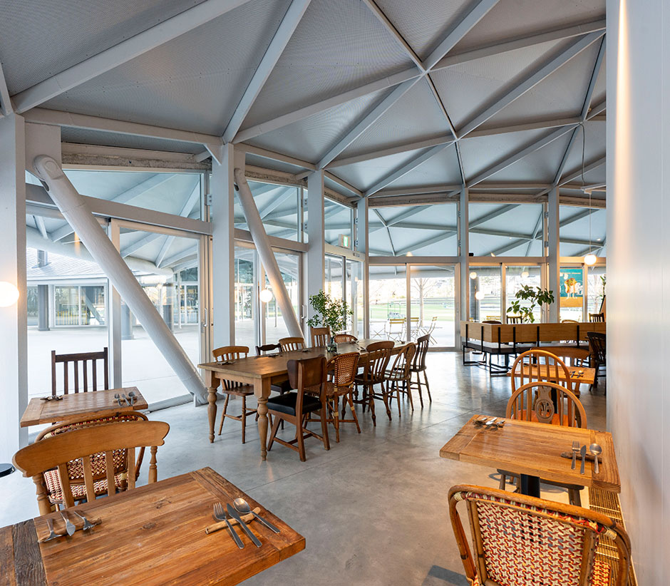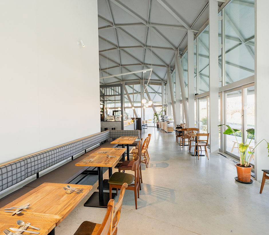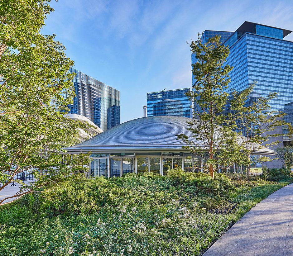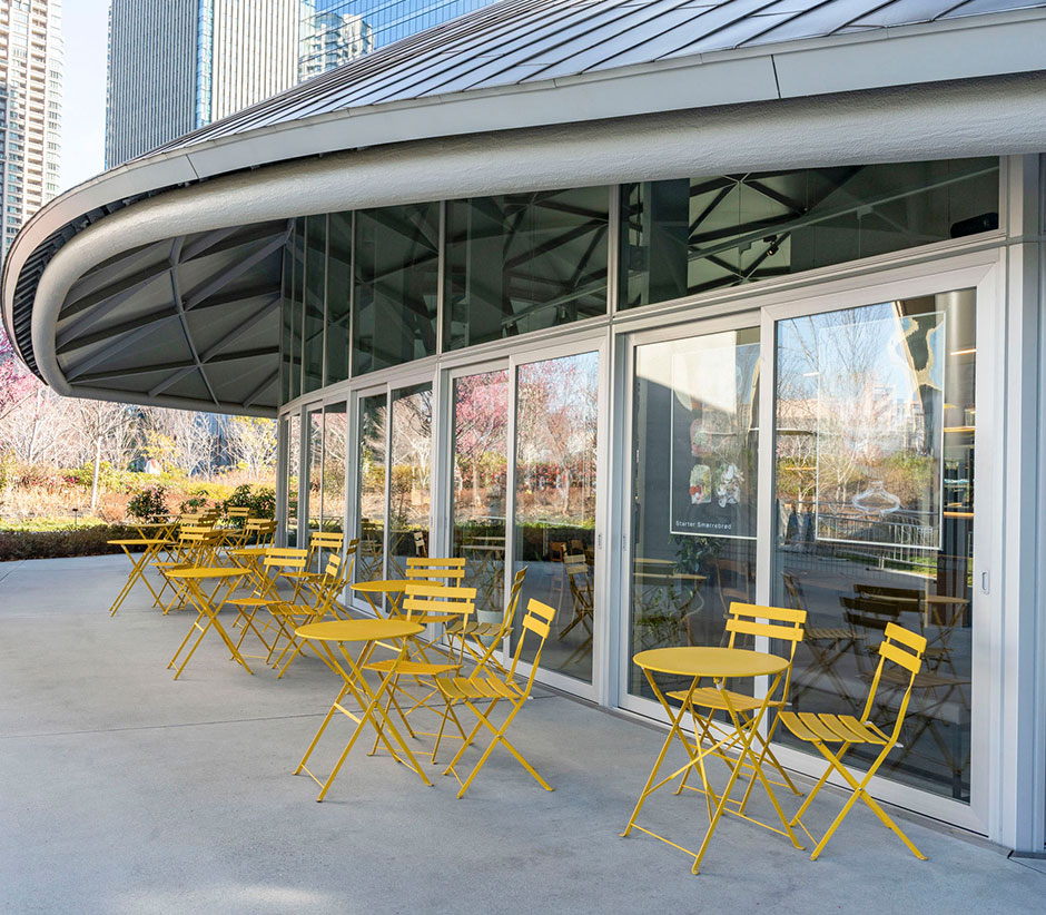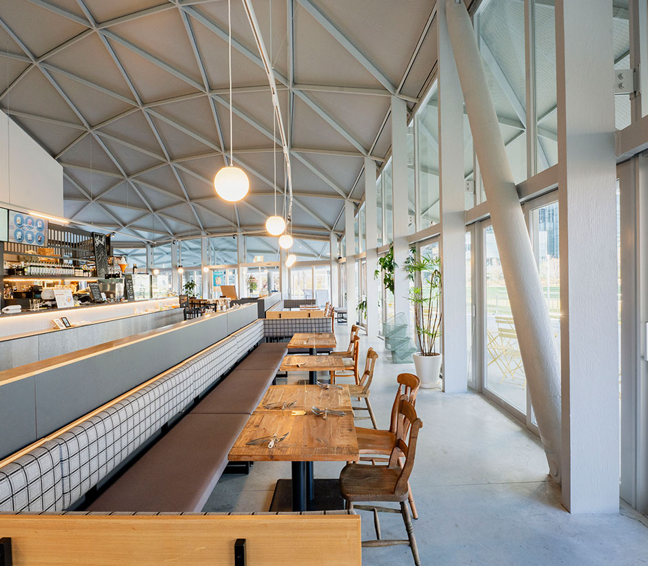 グラングリーン大阪 うめきた公園サウスパーク内にあるこの施設は、四季折々の都市公園の美しい景色を楽しみながらお食事いただける体験を提供するために建てられました。イベントスペースと連結する大屋根は、著名な建築家ユニット「SANAA」による設計。内装はモダンで落ち着いた雰囲気が特徴で、高い天井と自然光が溢れる大きな窓が魅力です。94席のテーブル席と50席のテラス席を備え、開放的な空間で厳選されたメニューをお楽しみいただけます。上質な雰囲気の中で、心地よい時間をお過ごしいただけます。