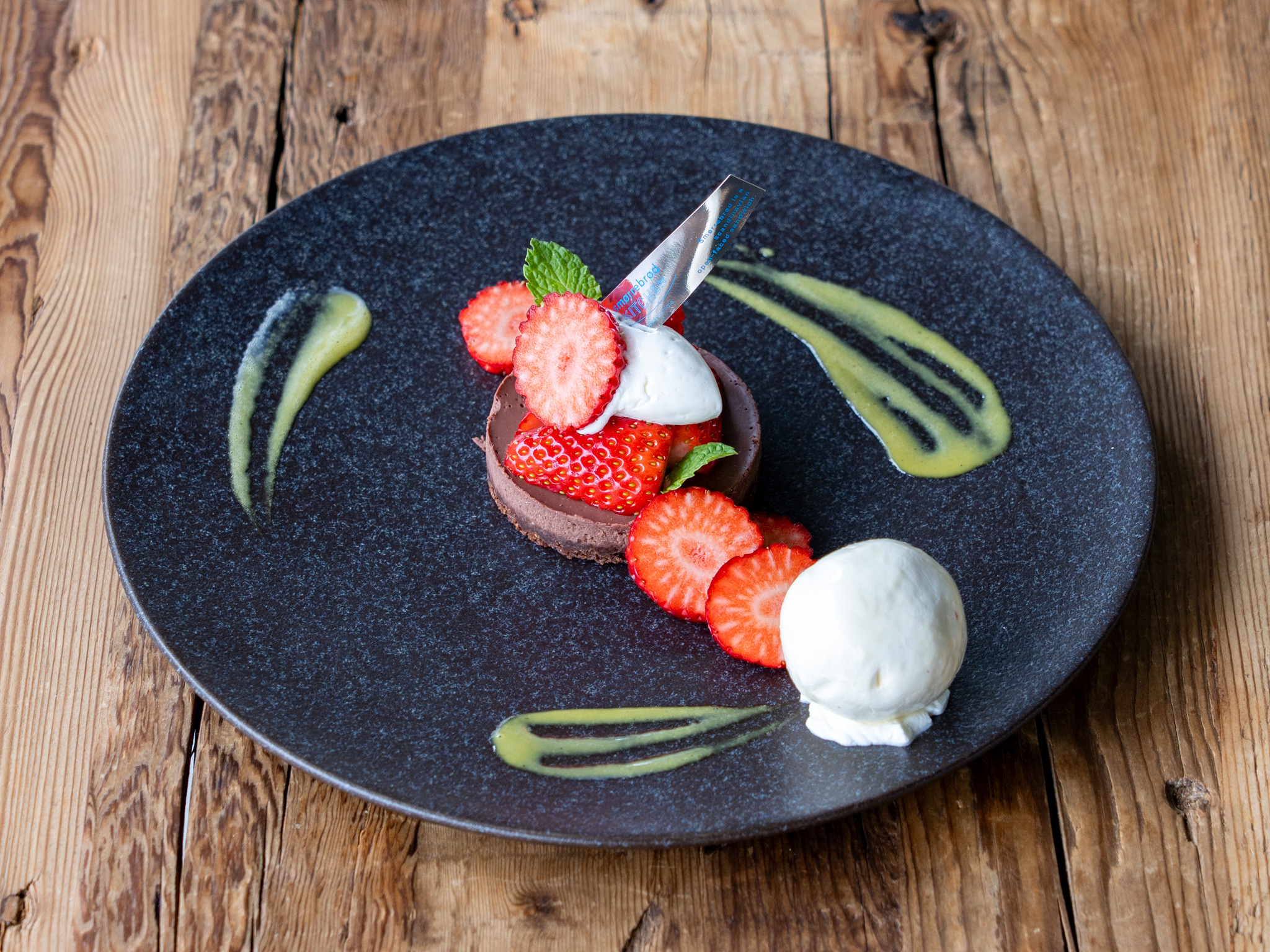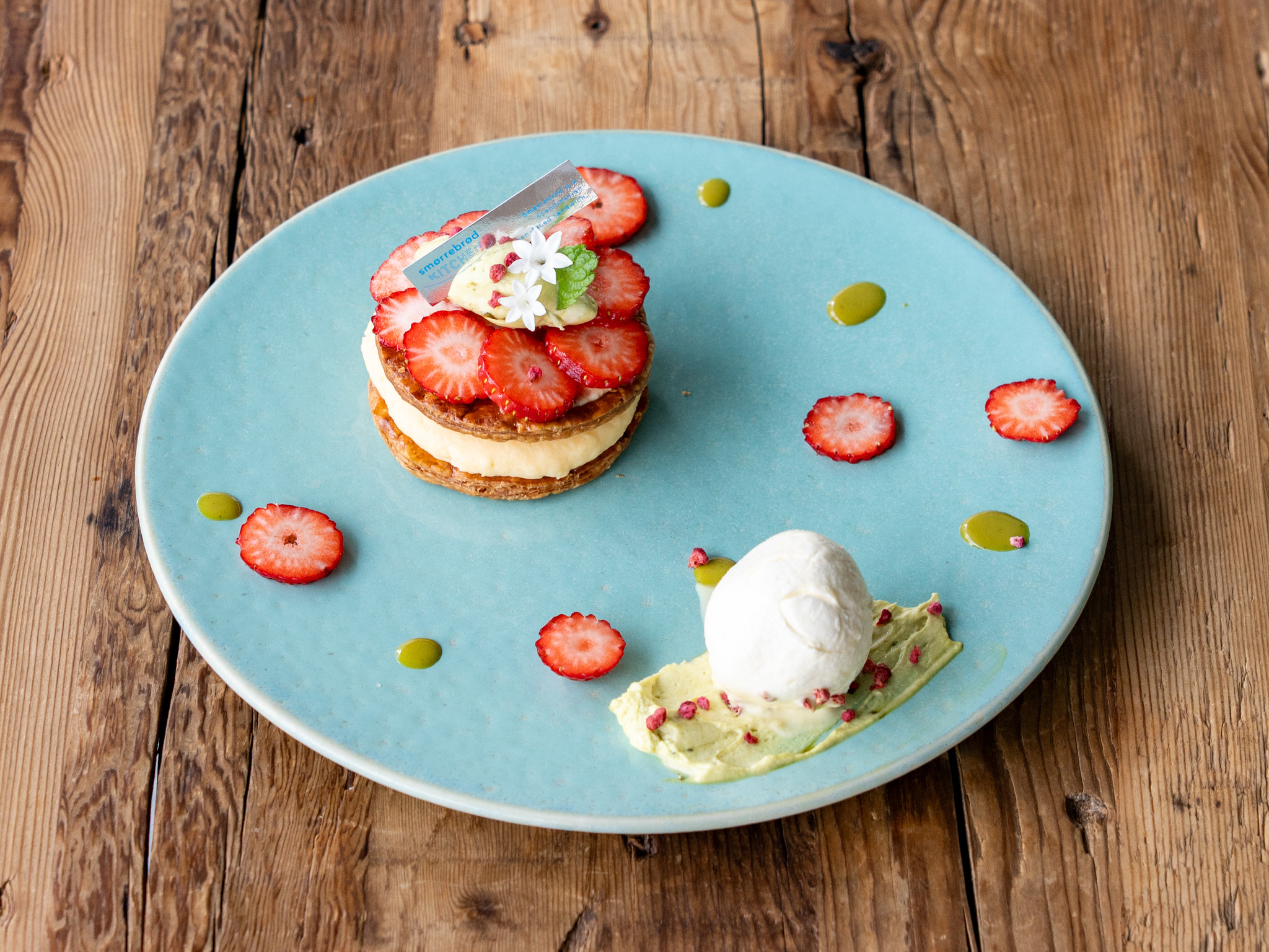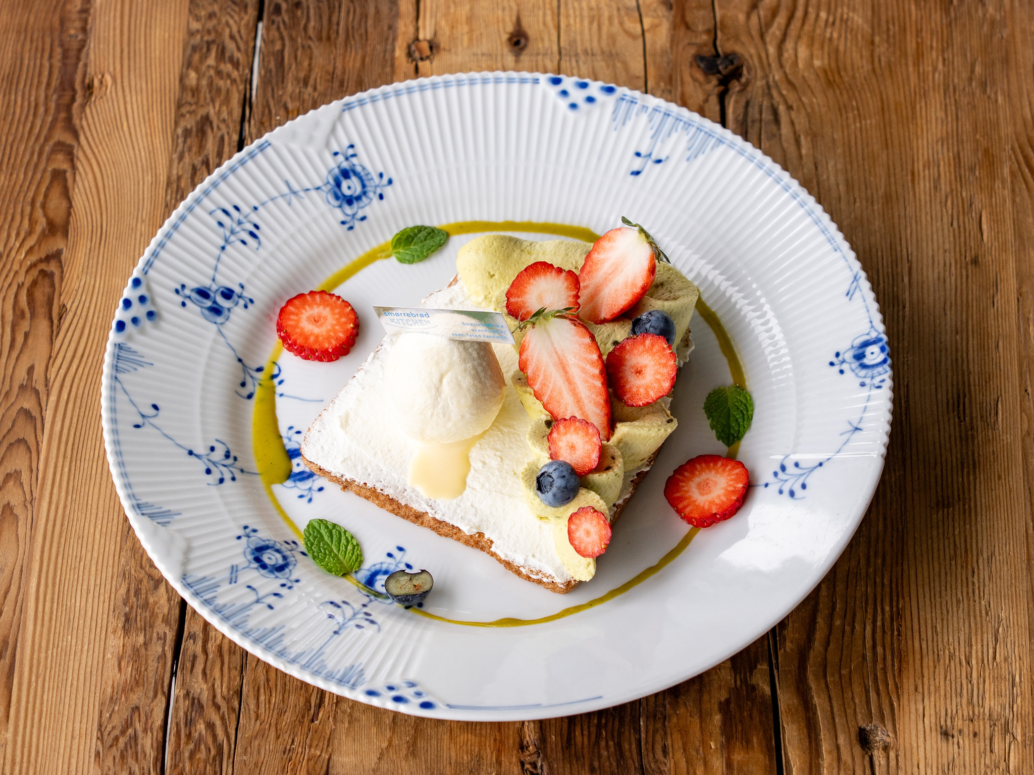 ライ麦パンに、北海道根釧生クリームとまりひめ。ピスタチオクリームを合わせ、ショートケーキのように楽しむ一皿。