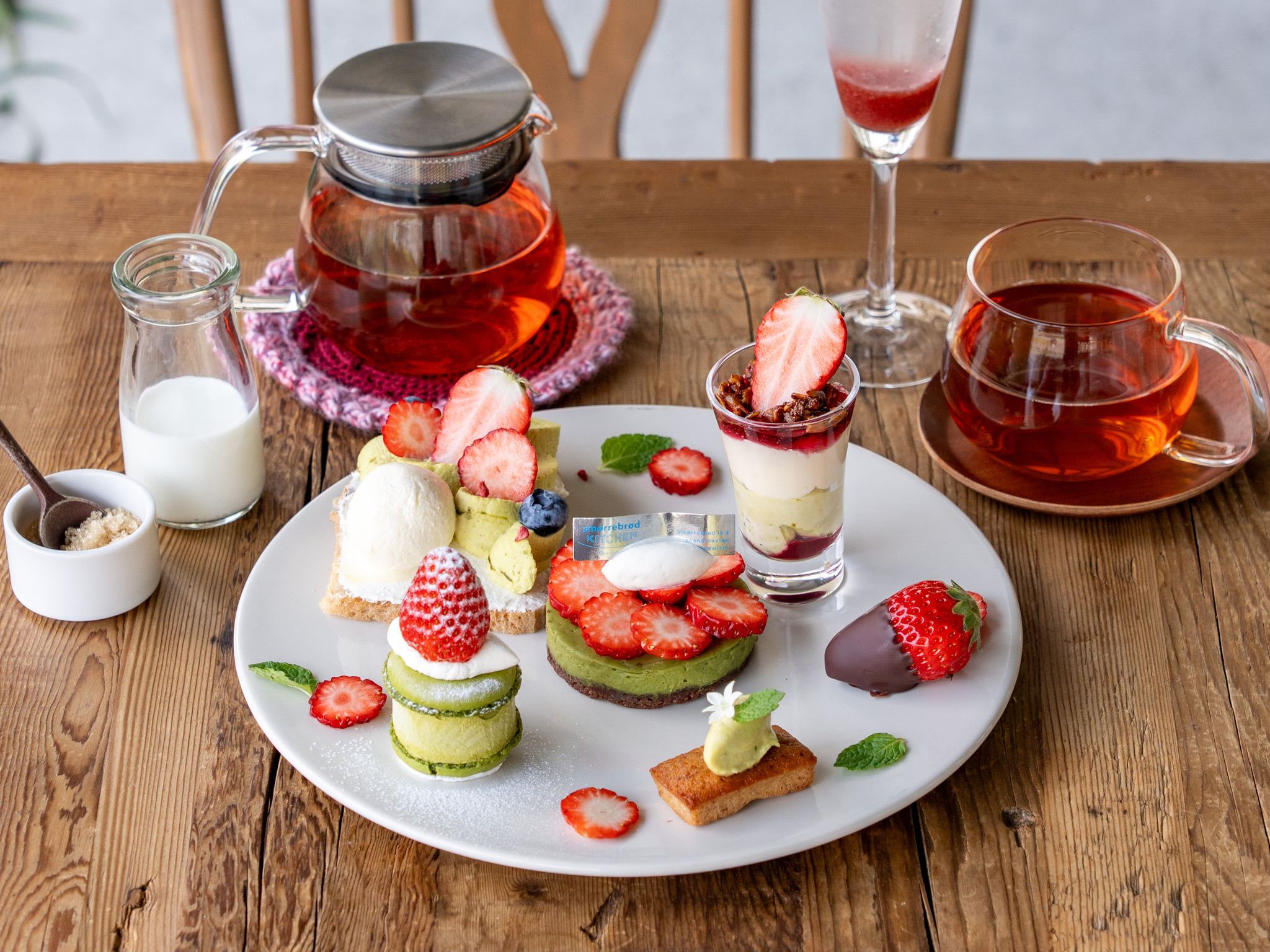 【内容】タルト・ショコラ・テ・ヴェール/いちごのミニパフェ/いちごとピスタチオのミニスモーブロー/抹茶のマカロンアイス/フィナンシェ/いちごチョコ/いちごのスパークリング(ノンアルコール)/フリードリンク付(お好きな紅茶orコーヒー)