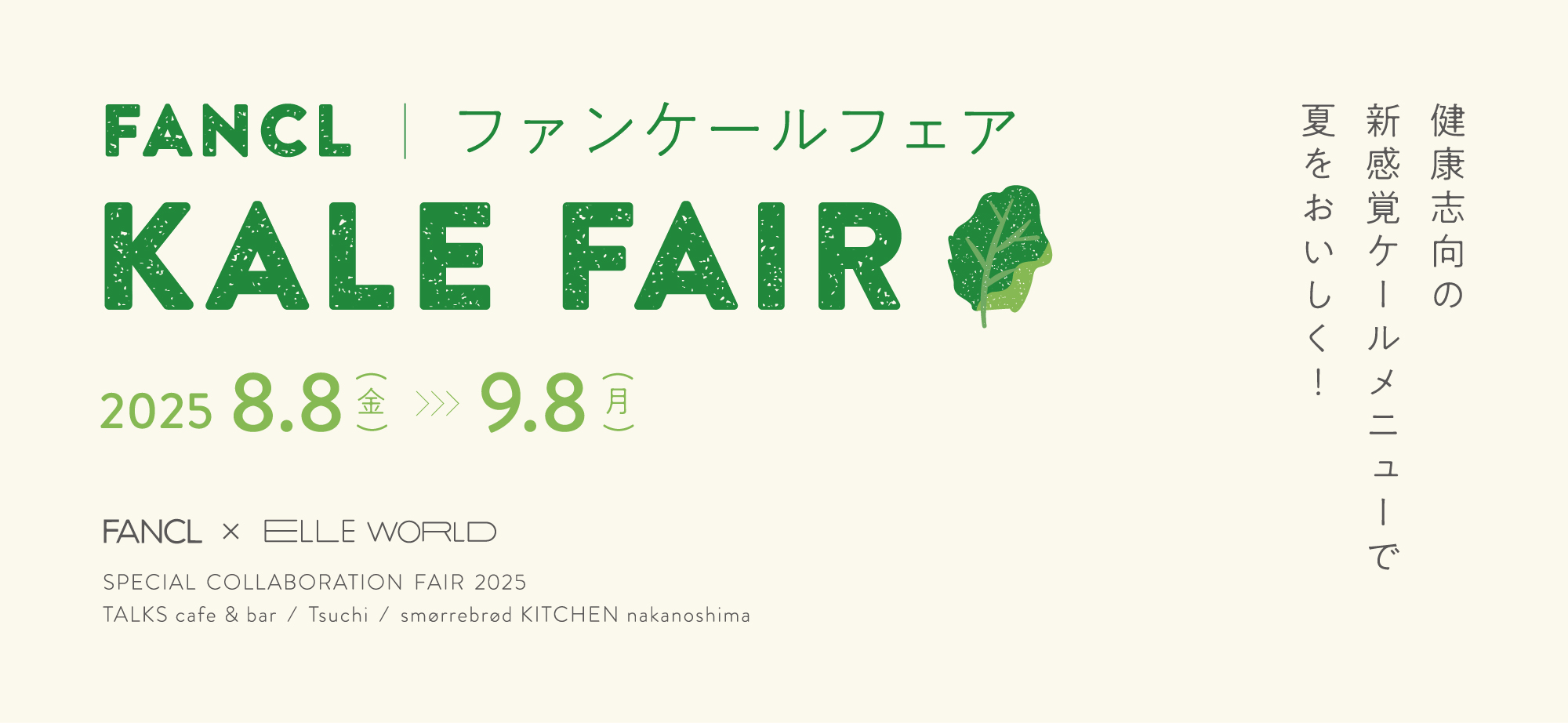 ファンケルの国産ケールを使用したコラボメニューを、2025年8月8日(金)から9月8日(月)の期間限定で提供します。8月31日の「野菜の日」も含めた本コラボでは、各店舗で趣向を凝らした、野菜の王様であるケールを使用したオリジナルメニューが登場。ケールのおいしさと健康を食事やドリンクで楽しくお届けします。