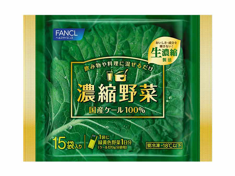 本メニューには、ファンケル独自の「生濃縮製法(※)」で、搾りたてのおいしさと成分を瞬間冷凍して閉じ込めた「濃縮野菜 国産ケール100%」を使用。1袋で1日分の緑黄色野菜量(ケール生葉120g分)を使用しています。